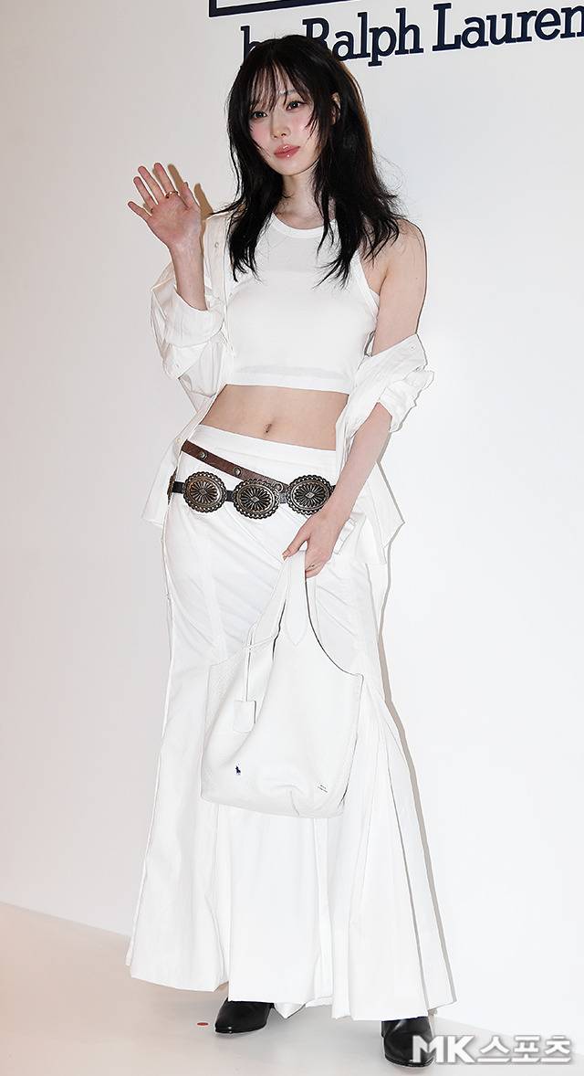 윈터는 미니멀한 크롭 니트 톱에 언밸런스한 셔츠를 걸치고, 플레어 라인의 화이트 롱스커트를 매치해 절제된 실루엣을 보여줬습니다.