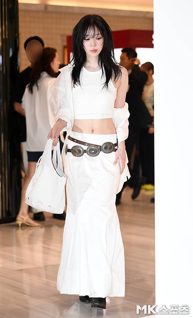 여기에 시선을 사로잡는 빈티지 웨스턴 벨트로 강렬한 포인트를 더하며 전체 룩의 분위기를 단숨에 반전시켰고, 블랙 첼시 부츠와 깔끔한 화이트 토트백으로 도시적인 감각을 잃지 않았습니다.