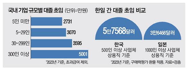 2023년 기준 30~299인 사업체 대졸 초임은 3595만원으로 300인 이상 사업체의 약 71.9% 수준이었다. 5~29인 사업체는 3070만원, 5인 미만 사업체는 2731만원으로 각각 300인 이상 사업체의 61.4%, 54.6% 수준에 그쳤다.