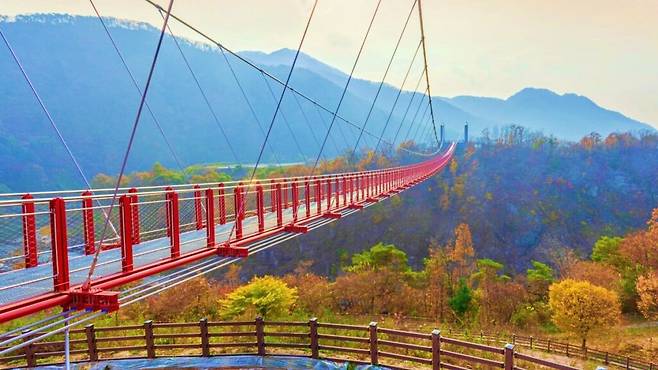 계곡 사이에 놓인 붉은빛의 철제 다리는 그 자체로 이국적인 느낌을 자아내며 다리 위에서 사진을 찍는 이들이 많다.