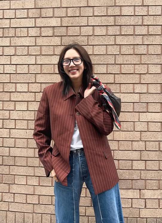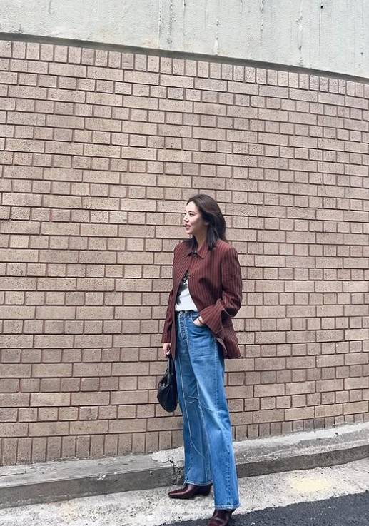 두껍지 않아 가벼워 보이는 벽돌색 재킷과 데님을 조합했어요. 너무 연하지 않은 데님으로 재킷의 채도를 유지.