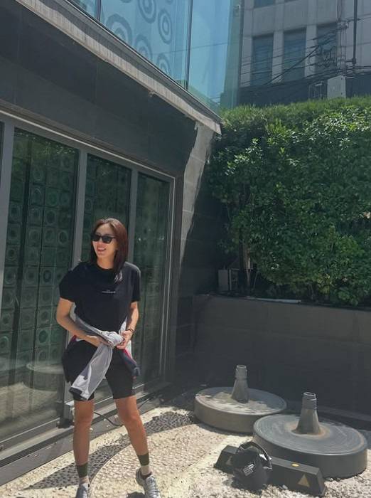 너무 짧지 않은 기장의 바이커 쇼츠를 매치해서 무드를 맞춰주었어요.