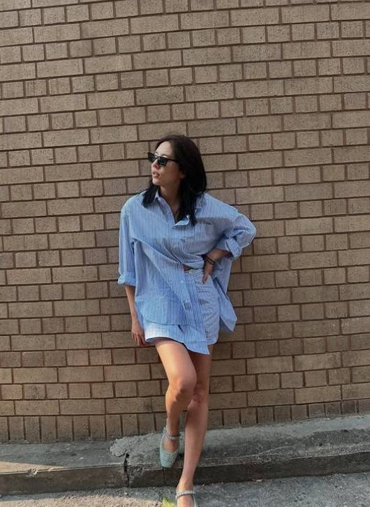셔츠 단추는 윗부분만 잠가 답답하지 않으면서도 하의 실루엣을 놓치지 않게 했어요.