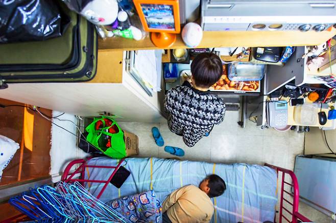 자동차 한 대를 주차할 정도의 공간입니다. 대부분 이런 공간에서 3명의 가족이 생활하고 있는데요. 침대 하나로 방이 거의 꽉 차다 보니, 살림살이들은 침대 위 선반에 쌓아놓을 수밖에 없죠.