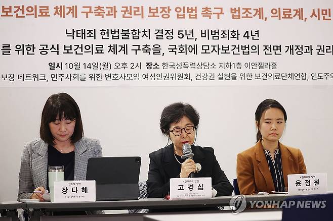 (서울=연합뉴스) 진연수 기자 = 14일 오후 서울 마포구 한국성폭력상담소에서 열린 '임신중지 비범죄화 후속 보건의료 체계 구축과 권리보장 입법 촉구' 법조계·의료계·시민사회 공동 기자간담회에서 고경심 산부인과 전문의가 발언하고 있다. 2024.10.14