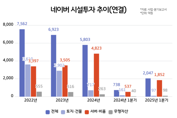 네이버의 연간 시설투자는 5000억원 이상 규모로 나타났다. 데이터센터 '각 세종' 구축이 한창이던 2022~2023년엔 각각 7562억원, 6923억원을 지출해 규모를 늘렸었다. 각 세종 구축을 대부분 마무리한 2024년엔 5803억원을 지출했다. 이러한 비용 지출은 구글·마이크로소프트(MS) 등 빅테크가 데이터센터 구축을 위한 비용을 늘리는 추세와 비슷하다. 빅테크들은 생성형 AI 서비스 대중화로 인해 늘어나는 트래픽을 감당하기 위해 전 세계 곳곳에서 데이터센터를 늘리고 있다.