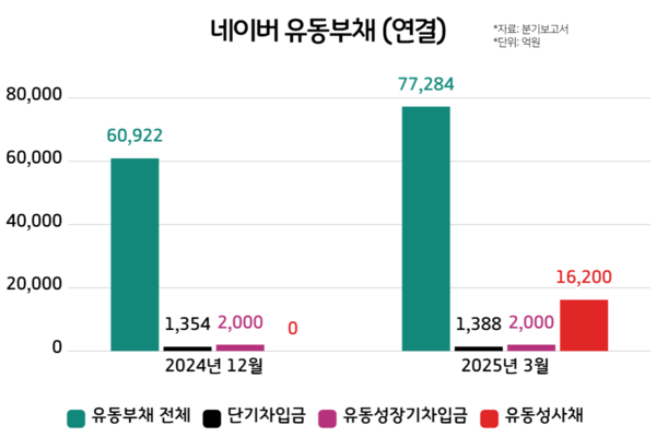네이버는 대출 외 방식의 외부 자금 조달을 원활히 하기 위해 2024년 3월 정기주주총회에서 정관을 변경하고 사채 발행 과정을 간소화했다. 사채를 발행할 때마다 이사회의 승인을 받던 방식을 대표이사 권한만으로 발행하도록 바꿨다. 다만 이사회가 정해놓은 연간 사채 발행 한도를 지켜야 한다. 2024년 1월엔 1700억원, 300억원 규모 공모사채를 발행했다. 각각 만기일은 2027년, 2029년이다. 이어 2024년 7월엔 커머스 플랫폼 크림이 154억원 규모 전환사채를 발행했다. 올해 3월 말을 기준으로 향후 1년 안에 상환을 앞둔 유동성 사채는 1조6200억원이다.