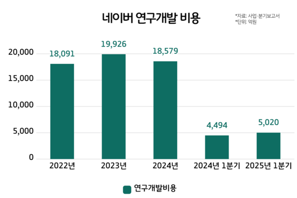 연구개발 비용 투자도 AI 경쟁력과 직결된다. AI 경쟁은 '쩐의 전쟁'으로 비유되는데, 고사양·고비용 GPU 등 인프라 확보, 우수 인재 유치, 도전적인 실험 환경 등 기술 경쟁력 요소를 갖추기 위해 충분한 재원이 필요하기 때문이다. 네이버의 연간 연구개발비는 2조원에 가까운 수준이다. 2023년 1조9926억원, 2024년 1조8579억원을 기록했다.
