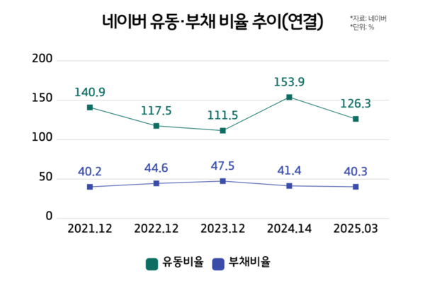 네이버는 이러한 AI 경쟁력 확보 재원을 사업 활동을 통한 수익, 차입과 사채 발행 등으로 조달했다. 특히 금융권 대출과 사채 발행 등 외부 자금을 얻기 위해 부채 비율을 40%대로 관리하는 등 대표적인 안정성 지표 관리에 힘을 쏟았다.