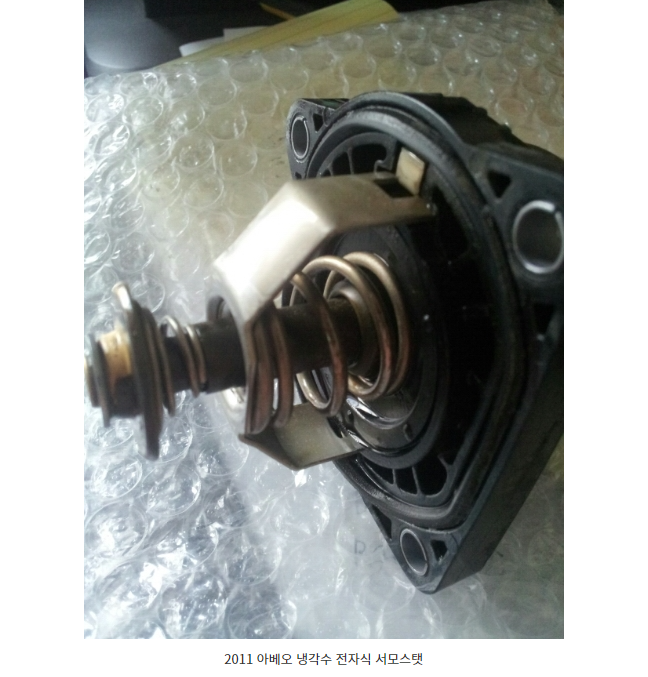 지금 보시는 건 저의 애차, 11년식 아베오의 냉각수 전자식 서모스탯입니다. 써머스타트 등으로 아주 괴상하게 불리는 이 녀석의 영어 단어 명칭은 thermostat입니다. 우리나라 말로 해석하자면 '수온 조절기' 정도로 부를 수가 있겠네요.