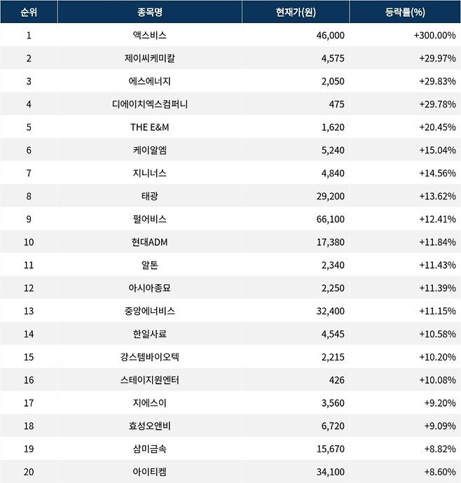 9일 오후 3시 30분 액스비스(0011A0)가 등락률 300.0%로 상승률 1위로 마감했다.