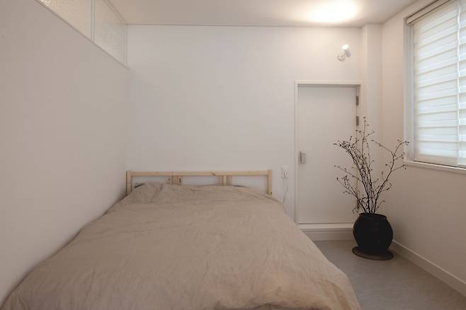 침실에 창이 크게 나 있어서 빛이 많이 들어와요. 이 빛을 주방까지 가져가기 위해 주방과 방 사이 벽 상부에 유리를 넣어 빛이 들어오게끔 설계했어요. 침대 옆 화분은 골동품 가게에서 다듬이 돌과 함께 데려온 장독 항아리인데 약간 깨지기도 하고 투박하지만 그래서 더 매력 있는 것 같아요.