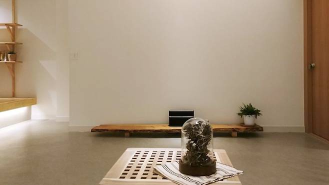 이 선반은 제가 직접 그려서 남편에게 만들어 달라고 부탁한 거였어요. 차를 자주 마셔서 관련된 다기를 놓아두었는데 마루와도 잘 어우러져서 만들기 잘했다는 생각이 들어요.