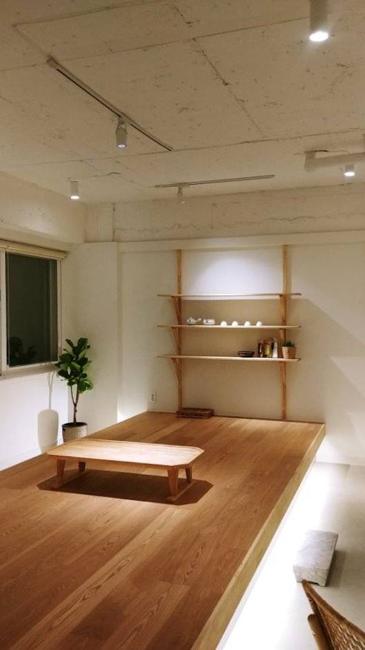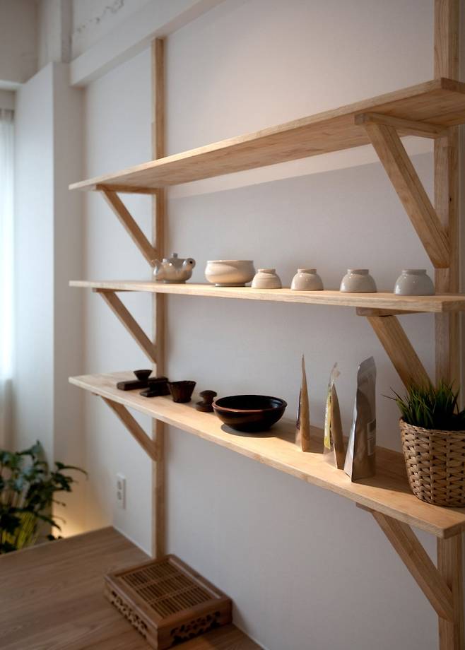 이 선반은 제가 직접 그려서 남편에게 만들어 달라고 부탁한 거였어요. 차를 자주 마셔서 관련된 다기를 놓아두었는데 마루와도 잘 어우러져서 만들기 잘했다는 생각이 들어요.