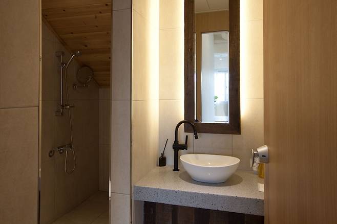 마지막으로 욕실은 전체 컨셉에 맞게 작은 공간이지만 필요한 부분을 갖추려고 노력했어요. 욕실의 샤워공간 천장도 원목으로 마감을 했는데요. 지나칠 수 있는 부분이지만 집 전체와 마찬가지로 곳곳에도 따뜻함을 느낄 수 있게 신경을 썼어요.