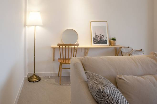 따뜻함이 느껴지는 베이지색의 소파 곁에는 작은 테이블을 놓았는데요. 마루를 더 활용하기 위해서 소파 쪽에는 일부러 최소한의 것들만 두었어요.