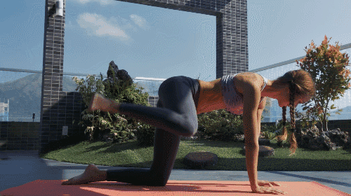 매트에 네발기기 자세로 엎드려 준비합니다. 오른쪽 다리를 옆으로 들어 올렸다가 천천히 내립니다. 이 동작을 반복합니다. 같은 방법으로 왼쪽 다리도 반복합니다.