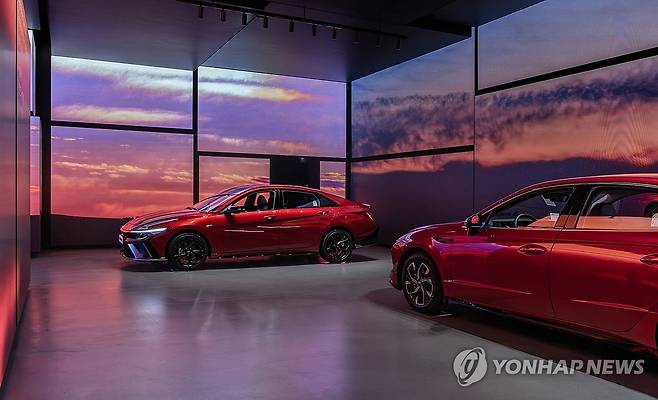 (서울=연합뉴스) 현대자동차가 브랜드 체험 공간인 '현대 모터스튜디오 하남'의 재단장을 마치고 새롭게 개관했다고 5일 밝혔다. 사진은 현대 모터스튜디오 하남에 전시된 '얼티메이트 레드 메탈릭' 외장 색상의 아반떼 N, 쏘나타의 모습. 2024.11.5 [현대자동차·기아 제공. 재판매 및 DB 금지]
