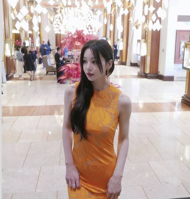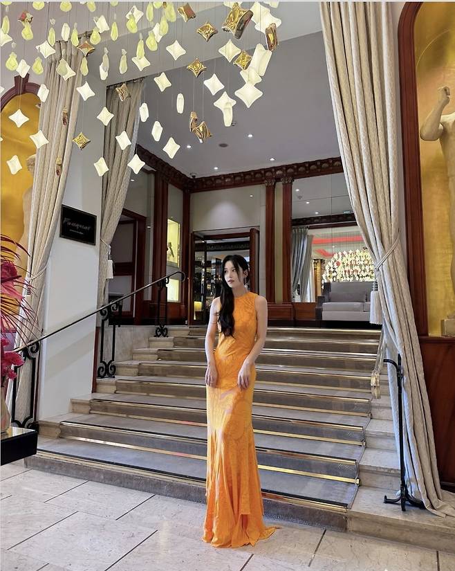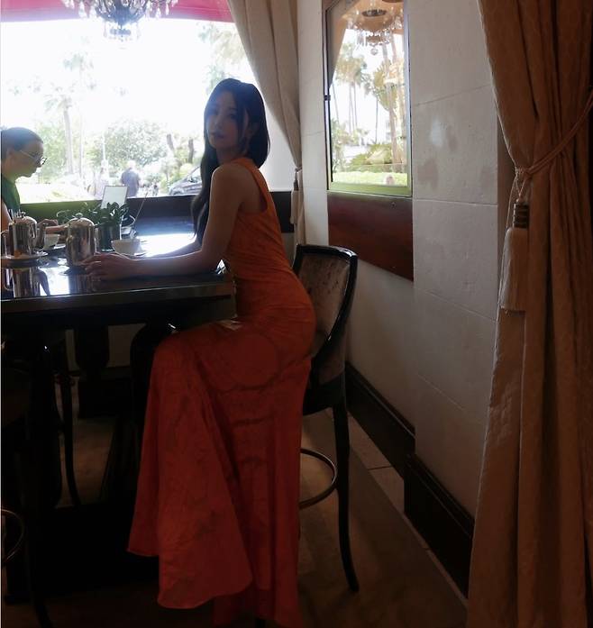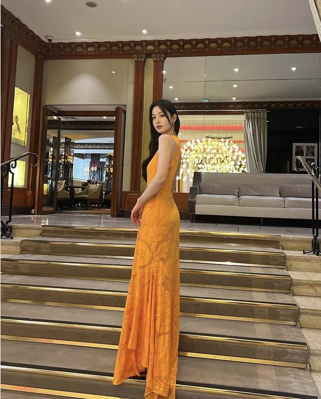 선명한 오렌지빛 드레스를 입은 남규리는 마치 햇살을 머금은 듯 화사한 아우라를 풍겼으며, 전신에 자연스럽게 밀착되는 슬리브리스와 백리스 실루엣이 매끈한 라인을 더욱 강조했습니다.
