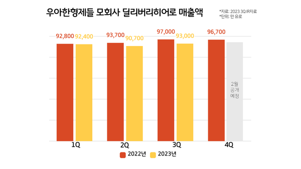 18일 우아한형제들 모회사 독일 딜리버리히어로 2023년 3분기 IR자료를 보면, 아시아 지역 총 상품 판매량(GMV. Gross Merchandise Volume)은 63억9000만 유로(약 9조3300억원), 매출액은 9억3000만 유로(약 1조3600억원)다. 각각 전년 동기보다 6.2%, 4.2% 감소했다.