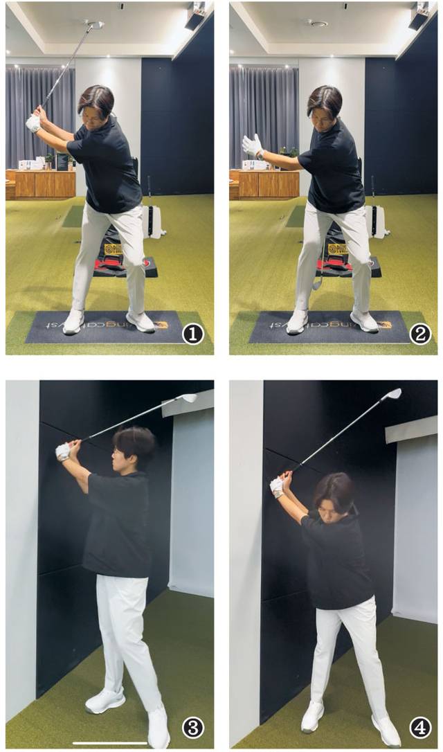 두 번째는 백스윙 톱을 만든 상태에서 그립의 끝부분을 벽에 맞대도록 해보자(사진③). 이때 사진④의 예시처럼 톱 동작에서 다운스윙 회전을 해준다면 맞대고 있는 벽으로 인해 상체는 톱스윙 모션을 계속해서 유지할 수밖에 없고 다운스윙으로 전환하는 트랜지션에서 몸의 움직임을 극대화하며 느낄 수 있게 되는데 이때 왼 다리를 시작으로 복부, 엉덩이, 그리고 뒤쪽 근육인 광배근의 근육이 쓰이는 움직임을 느껴볼 수 있다.
