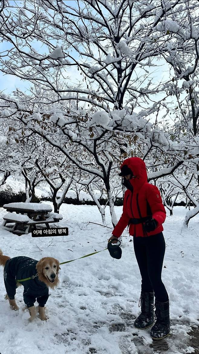 또한, 제이제이의 아웃도어 감성을 강조한 방한 모자와 장갑은 눈 속에서도 따뜻함을 유지하는 완벽한 산책 아이템이었습니다.
