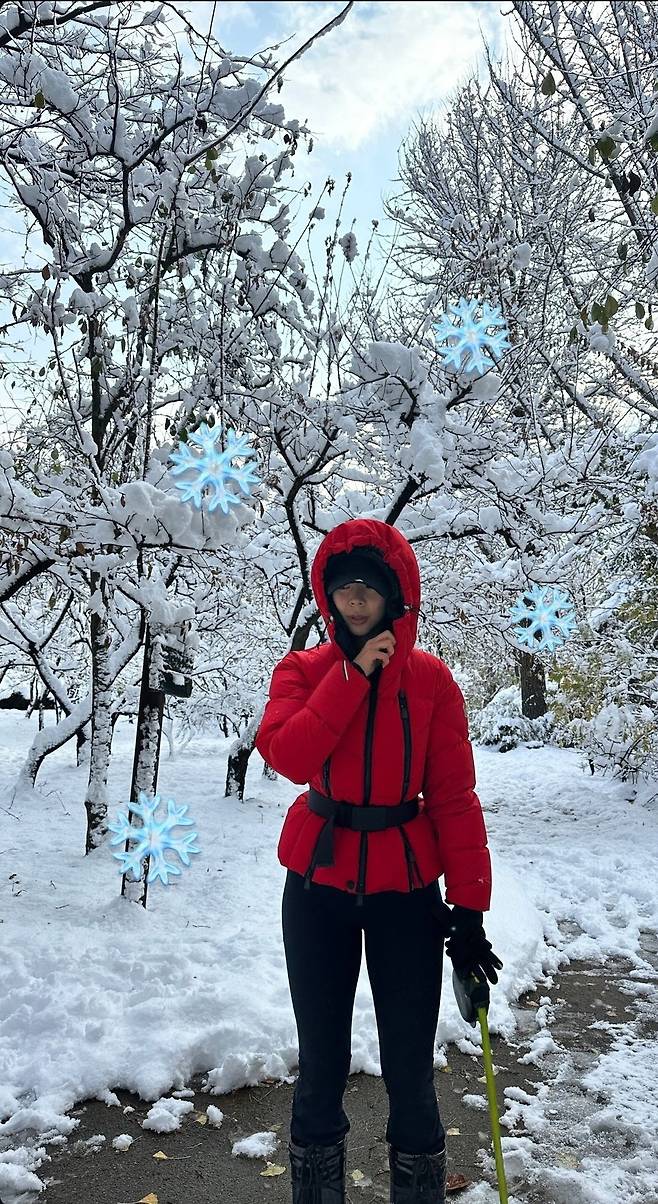 이와 함께 제이제이는 블랙 레깅스를 매치해 레드 패딩과의 컬러 대비로 강렬한 포인트를 살렸습니다.