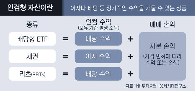 인컴형 자산은 이자나 배당 등 정기적인 수익을 거둘 수 있는 상품이다. 수익을 얻는 법은 크게 두가지다. 첫번째는 자산을 보유해 이자·배당 등을 주기적으로 받는 것이다. 두번째는 상품을 팔아 매매 차익을 보는 경우다.