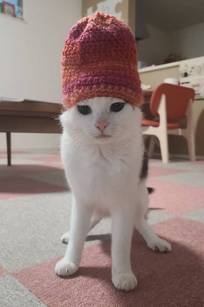 친구의 친구로부터 손 뜨개질로 직접 만든 고양이 전용 니트 모자를 선물 받은 것이 아니겠습니까. 누가 봐도 고양이 사이즈에 맞춘 니트 모자였죠.