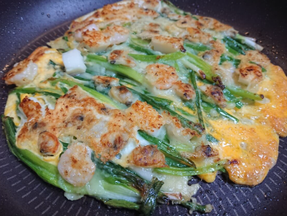 팬을 사용할 때는 반드시 예열을 충분히 하고, 기름은 넉넉히 둘러야 한다. 반죽을 얇게 펴는 것이 바삭한 파전을 만드는 또 다른 핵심이다. 건새우는 수분이 적기 때문에, 반죽이 두껍게 깔리면 속은 익지 않고 겉만 타는 경우가 생길 수 있다.