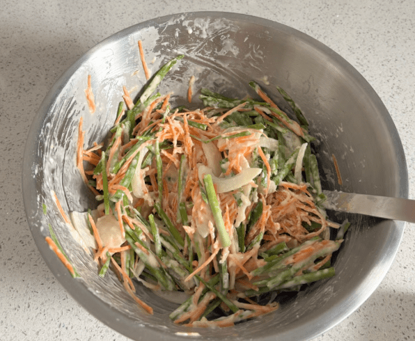 파전의 핵심은 쪽파다. 적당한 길이로 썬 쪽파를 그릇에 담고, 채 썬 당근과 건새우를 넣는다. 여기서 중요한 포인트는 쪽파와 건새우의 양을 어느 정도 비슷하게 맞추는 것이다. 쪽파의 아삭함과 건새우의 바삭함이 균형을 이룰 때 식감이 가장 좋다.