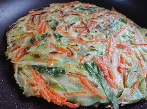 여기에 부침가루를 넣고 물을 부어가며 농도를 조절한다. 반죽은 너무 묽지 않게, 숟가락으로 떠봤을 때 천천히 흐를 정도로 맞추는 것이 좋다. 당근은 색감을 더하면서도 식감에 변화를 주는 재료로, 많이 넣지 않아도 존재감이 충분하다. 양파나 청양고추 등 다른 채소를 추가해도 잘 어울린다.