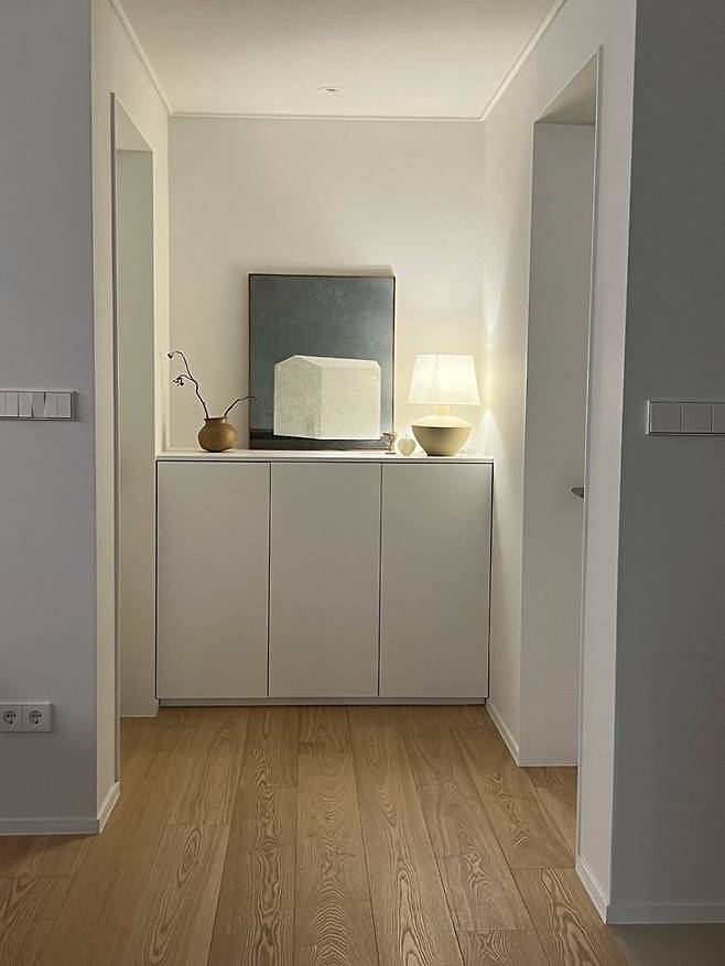 저희는 이 공간을 아예 더 높은 장으로 만들어서 더 많은 수납공간을 확보할까도 고민했지만, 저는 중문을 열고 들어왔을 때 가장 먼저 보이는 공간이어서 꼭 좋아하는 작가님의 그림과 좋아하는 소품들을 놓고 싶어서 간단한 수납이 되는 심플한 장으로 마무리했답니다.