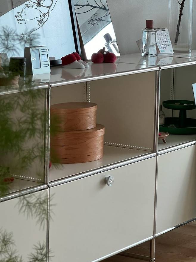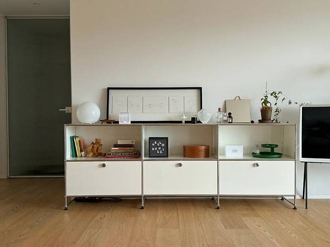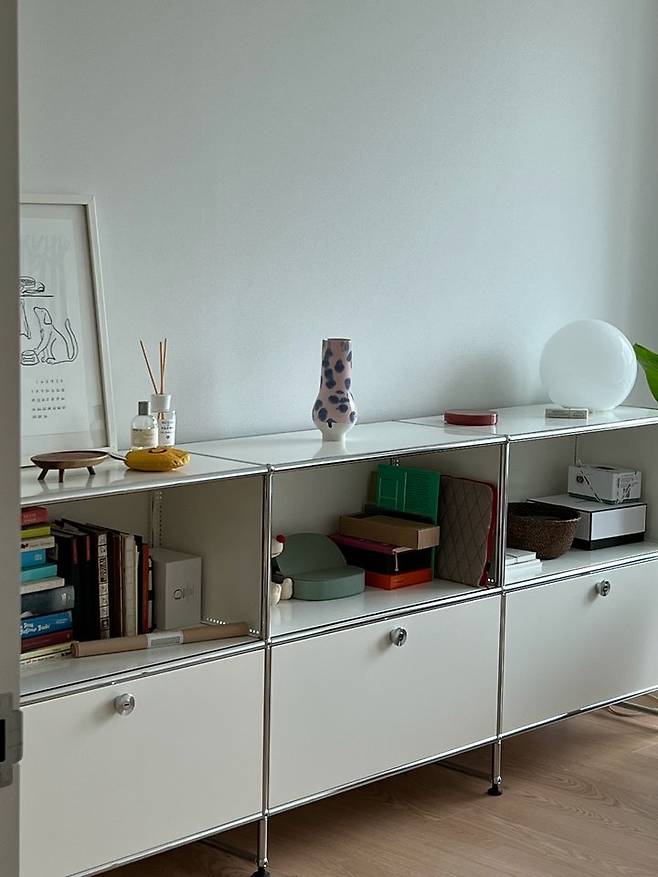 요즘은 서재에 있던 USM 모듈 서랍장을 거실로 가져왔는데 또 다른 분위기를 낼 수 있어서 좋더라고요!