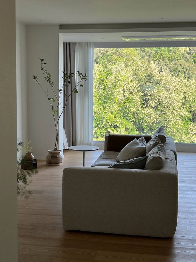 통창과 넓은 거실 덕분에 계절에 따라 요리조리 가구 배치하는 재미가 있는 것 같아요.
