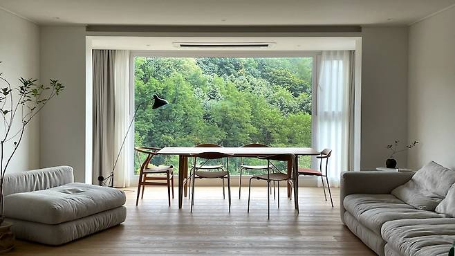 다소 오래되고 낡은 집이지만 집 앞의 산을 한껏 품은 뷰에 한눈에 반해, 저는 이 집을 고치면 어떻게 변할지 머릿속에 촤라라 그려져서 덜컥(?) 계약하게 되었어요. 거실의 창 하나가 사계절을 담는 아름다운 액자가 될 것 같아 최대한 창이 돋보일 수 있도록 집을 갤러리 같이 심플하게 고치게 되었어요.