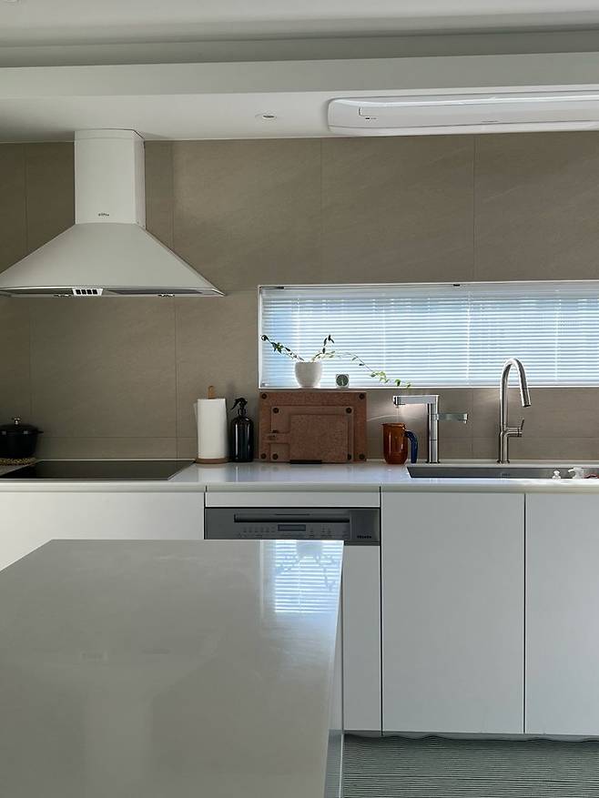 긴 아일랜드의 중앙에는 제가 좋아하는 소품들을 배치해 놓고, 취미로 새벽 꽃 시장에서 가끔 사 오는 꽃들로 채워 놓아요. 넓고 긴 아일랜드 덕분에 이 위에서 베이킹, 꽃 손질 등 다양한 작업들을 할 수 있어서 참 좋답니다!