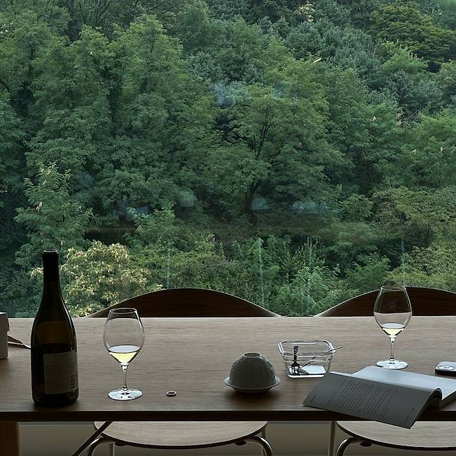 이 공간도 산 뷰여서 또 다른 액자를 보는 맛으로 코로나로 재택근무만 가능하던 때에 참 좋아했었던 기억이 있네요. 자취하면서 썼던 라운드 테이블은 버리기 아까워서 집으로 가져왔었는데, 여기서 커피 마시며 일을 하기 딱 좋더라고요!
