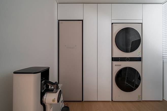 안방 앞의 작은 방은 세탁기와 스타일러, 옷장 및 기타 수납이 가능한 방으로 만들었어요. 원래는 부엌 옆 베란다에 세탁기가 들어가야 하는데, 시스템 에어컨을 설치하게 되면서 실외기를 베란다에 설치해야 하다 보니 세탁기가 들어갈 곳이 없어 이런 구조가 나왔어요.