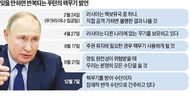 블라디미르 푸틴 러시아 대통령이 또다시 핵무기 사용 가능성을 거론했다. 미국은 “무책임한 발언”이라며 즉각 비판했다.