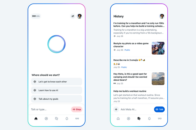 마이크를 사용할 때는 이를 알리는 아이콘이 표시된다. 라마 4를 기반으로 작동하는 메타 AI는 인간과 대화하는 듯한 어조의 답변을 제공한다고 한다. 이미지 생성 및 편집 등 기능도 탑재돼, AI 비서와의 대화를 통해 모든 작업을 수행할 수 있다.
