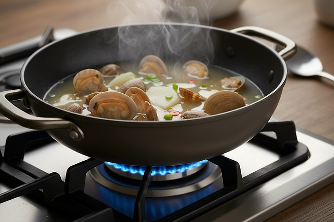 4. 해감한 모시조개를 넣고 뚜껑 덮어 3-4분간 끓입니다 (조개 입이 벌어질 때까지)