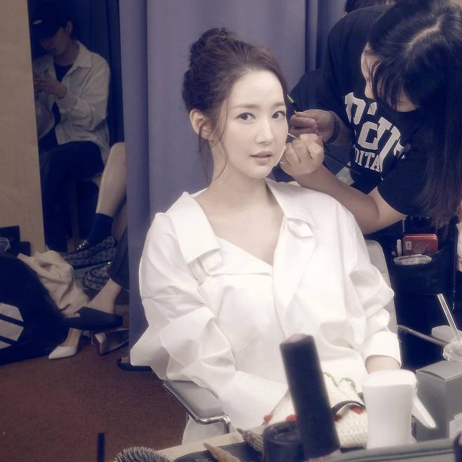 촬영장에서 포착된 메이크업 중인 모습으로, 화이트 셔츠를 착용한 깔끔한 스타일을 선보이고 있다. 단정하게 올린 헤어스타일과 내추럴한 메이크업이 프로페셔널한 분위기를 연출한다.
