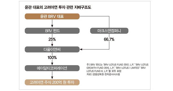 윤 대표의 고려아연 주식투자에 동원된 기업은 에이알티코퍼레이션(에이알티)이다(도표 참조). 에이알티는 2021년 설립된 투자 전문기업으로, 다올이앤씨(옛 VSL코리아)가 지분 100%를 소유하고 있다. 다올이앤씨는 2016년 윤 대표가 주도한 서울 강남구 르네상스호텔 재개발 사업 주관사로 알려졌으며, 윤 대표와 그 주변인 자금이 투입된 마크스앤컴퍼니유한책임회사(마크스앤컴퍼니)와 윤 대표가 운용하는 BRV 펀드를 주요 주주로 두고 있다. 즉 윤 대표를 꼭대기에 두고 마크스앤컴퍼니와 BRV 펀드, 다올이앤씨, 에이알티로 자금이 흐르는 구조인 것이다.