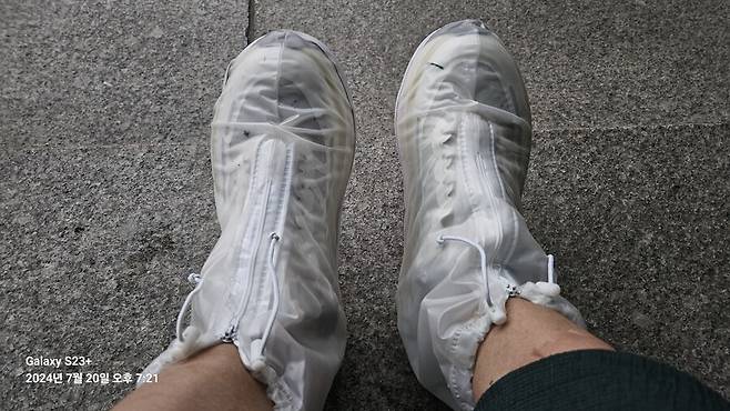 신발 방수커버 꺼내 신었습니다.
