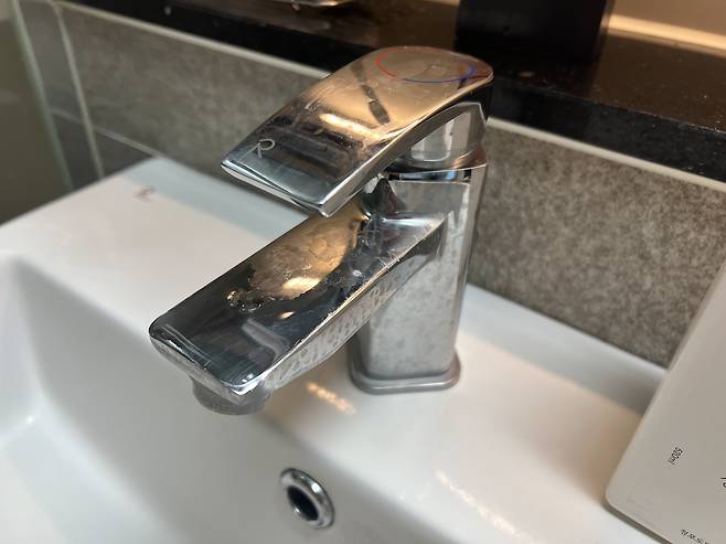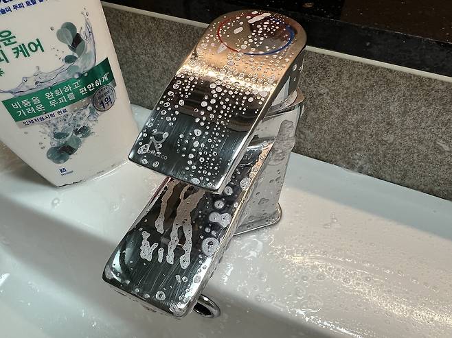 4. 세면대에 뿌린 후 스펀지로 문질러 닦아주세요