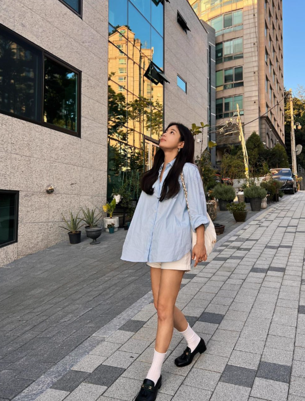 오버핏 롱셔츠에 핫팬츠 코디
