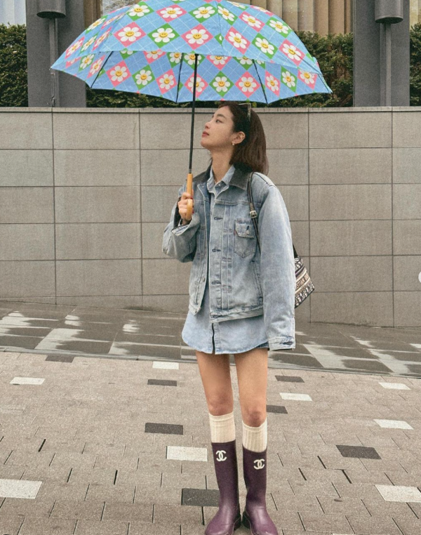 비오는 날엔 청청패션에 레인부츠.
