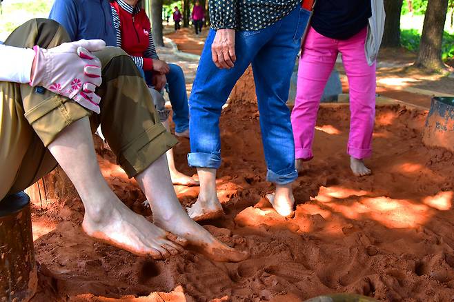 황토는 특유의 따뜻하고 폭신한 감촉으로 발에 전해지며, 걷는 것만으로도 혈액순환이 촉진되는 기분을 느끼게 한다.