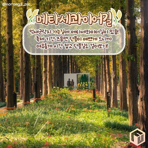 서울 하늘공원 억새축제에 방문한다면 억새군락으로 가는 길에 위치한 메타세콰이어숲길도 지나보세요!